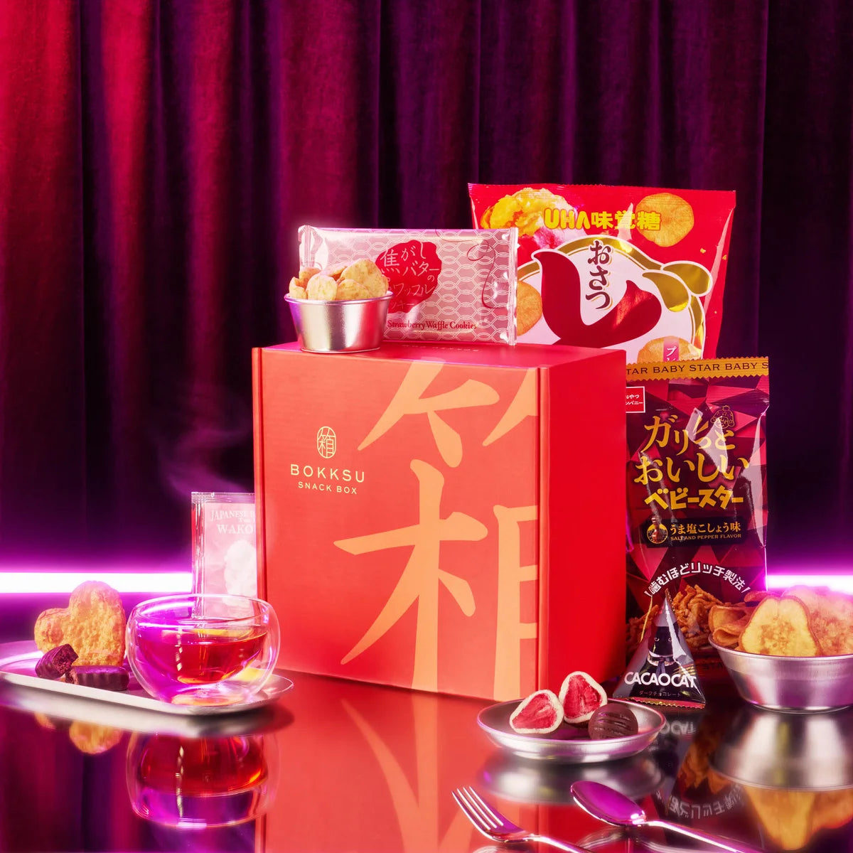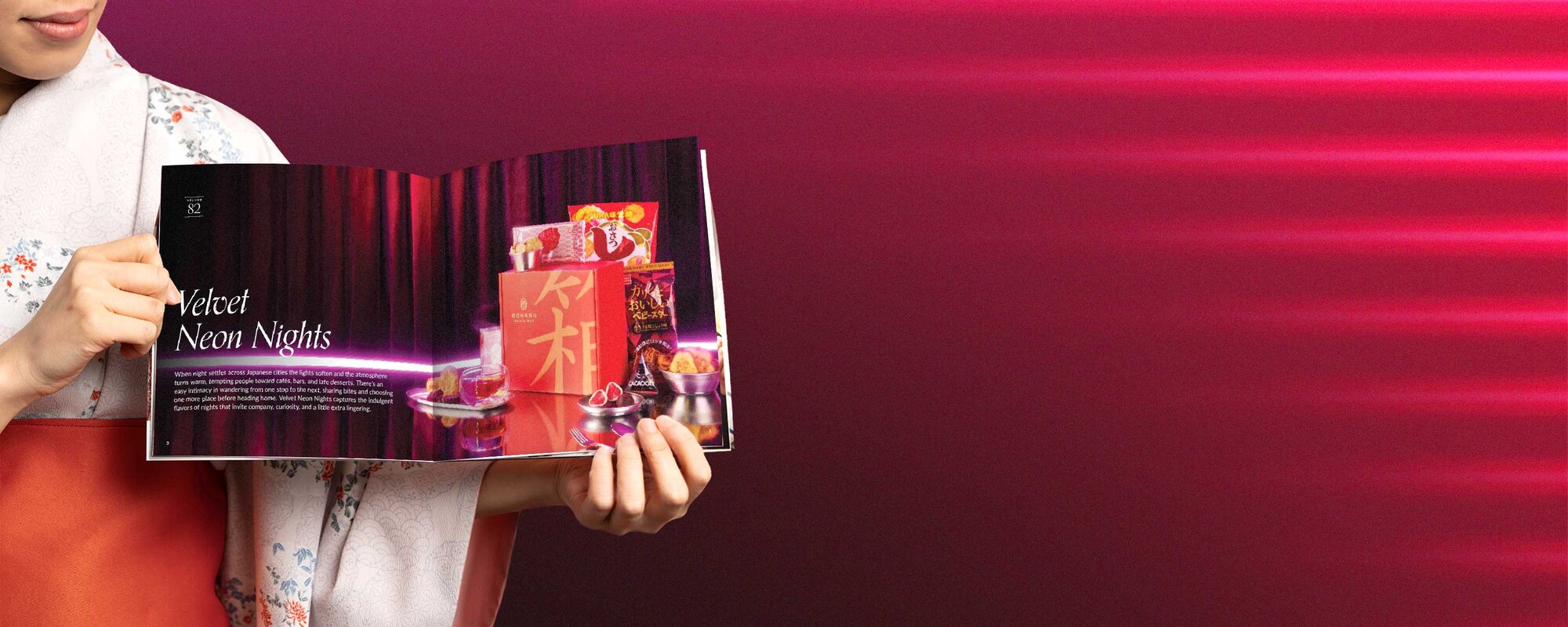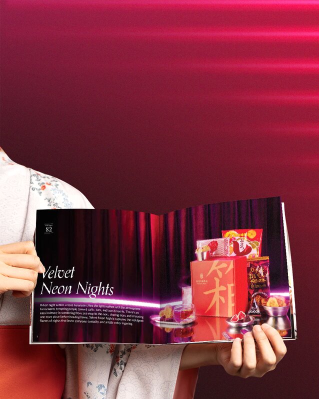 Discover the stories, flavors, and cultural details behind each snack with our monthly culture guide. This month, Velvet Neon Nights explores Japan’s cities after dark, where cafés stay open late, izakayas buzz with warmth, and small indulgences define the evening.